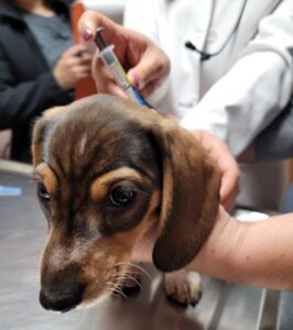 Puppies will be vaccinated every 3-4 weeks until 16 weeks of age with a minimum of 2 DHPPs given between 8-16 weeks. Rabies can be given at 16 weeks of age.