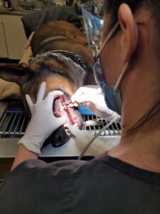 Preventative dental care is very important for your pet’s health. During your pet’s annual wellness examination, our veterinarians will perform a dental examination as well. The most common and serious dental problem of neglected dental care is periodontal (gum) disease. The disease is caused by a build-up of plaque and calculus below the gum line. Calculus gets deposited on tooth surfaces, causing the gums to recede, and then bacteria pockets to form. The bacteria infect the gum tissue, as well as the roots of the teeth. Eventually, the affected teeth will fall out. The bacteria can mechanically reach the throat and cause respiratory infections and coughing. The bacteria can also enter the bloodstream through blood vessels near the gum and infect organs elsewhere in the body.