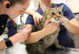 Kittens will be vaccinated every 3-4 weeks until 12 weeks of age with a minimum of 2 FVRCPs given between the ages of 8-12 weeks. FeLV can be given at 9 weeks. We also recommend FeLV/FIV test at this time. Rabies can be given at 12 weeks.